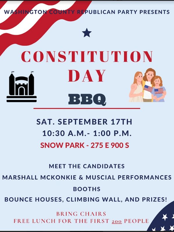 Join us after the Dixie Roundup Parade for a Constitution Days Celebration,10:30am-1:00pm at JC Snow Park. Fun for the whole family with booths sponsored by our Republican Candidates and others highlighting different sections of the Constitution with fun activities. We will also have prizes, a bounce house and a Climbing Wall with great entertainment as well. The first 200 attendees will receive free BBQ as well. After the event, go on over to the St George Tabernacle for the Daughters of the